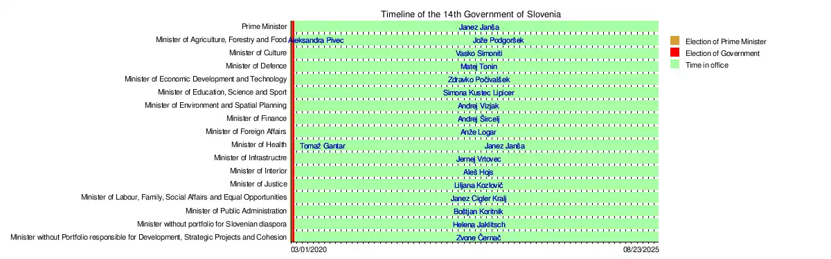 The 14th Government of Slovenia was formed following the resignation of Prime Minister of the 13th Government Marjan Šarec in January 2020. Janez Janša of Slovenian Democratic Party formed a coalition with Modern Centre Party, New Slovenia, and Democratic Party of Pensioners of Slovenia. The government was confirmed on 13 March 2020, amidst the COVID-19 pandemic.