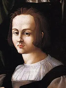 5. Angelo Doni wears Italian fashion: a dark doublet with pink sleeves, loose hair, and a hat with a turned-up brim, 1506.