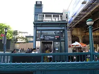 The 161st Street–Yankee Stadium station is a New York City Subway station complex shared by the elevated IRT Jerome Avenue Line and the underground IND Concourse Line. It is located at the intersection of 161st Street and River Avenue in the Highbridge and Concourse neighborhoods of the Bronx. It is generally served by the 4 train at all times; the D train at all times except rush hours in the peak direction (unless there is an event at Yankee Stadium, and in such event, express trains will stop[4]); and the B train weekdays until evening.
