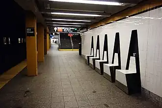 The 2002 artwork here is called Wall-Slide by Vito Acconci, which consists of sections of the station walls "sliding" out of place, sometimes out of the station. Wall-Slide forms seating on the IND platforms, and also reveals a mosaic work, Room of Tranquility by Helene Brandt, on the IRT mezzanine.[32]