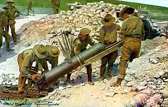 In March and April, the division's infantry brigades formed light trench mortar batteries (TMBs). Then a brigade of medium and heavy trench mortars was formed by the divisional artillery. The establishment was one heavy and three medium TMBs per division, but 32nd Division was allotted two heavy and five medium to increase its firepower for the planned 'Big Push' (the Battle of the Somme).[14][19][20][21] In April the 32nd (Hull) Heavy Trench Mortar Battery was formed with men drawn from 32nd (Hull) DAC, together with a few RGA men, and moved to Aveluy for training. It was designated V/32 Heavy TMB and was joined in May by W/32 Heavy TMB, formed by men drawn from 32nd DAC and CLXI, CLXIV and CLXVIII BACs. These batteries were equipped with French 9.45-inch Heavy Mortars (known as 'flying pigs'). The five Medium TMBs (A, B, X, Y and Z, each equipped with four 2-inch Medium Mortars) were formed by the end of May with personnel drawn from the DAC and various batteries and HQs in 32nd DA. V/32 and W/32 Heavy TMBs joined the division from the TM School by the end of June.[14][22][23]