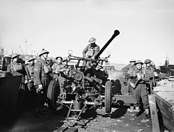 After the North African Campaign ended with the capture of Tunis in May 1943, 56th (EL) LAA Rgt was once again acting as X Corps' LAA regiment.[28][32] X Corps was not employed in the Allied invasion of Sicily, but trained for the subsequent assault landings at Salerno on the Italian mainland (Operation Avalanche). It had the task of capturing the Port of Salerno and Montecorvino Airfield, then turning north to capture Naples. The landings on 9 September were difficult, but a beachhead was successfully achieved. The first major hitch occurred when Montecorvino Airfield was not captured in the first rush, and continued to be fought over for the next four days. Even then the beachhead battle raged for days within 3,000 yards (2,700 m) of the shore. The divisional LAA regiments, together with 12 AA Bde, which provided the AA components of the Beach groups, were landed into this crowded space. However, a breakout was achieved on 16 September and the rest of X Corps could pour ashore. As corps LAA regiment, 56th's role now was to defend HQs, gun areas and other VPs as X Corps first captured Naples on 1 October, and then moved on to assault the German positions on the River Volturno on 12 October. The corps then had a stable period as the Allies faced the German Winter Line.[33][34][35]