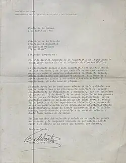 ![]() Letter of congratulation from Fidel Castro on the 25th anniversary of 16 de Abril | |