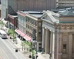 The buildings were owned by Plaza Properties in recent years. Along with the Ohio National Bank building on the block, the buildings have sat largely vacant, without significant investments or improvements. Their vacancy was highlighted in 2016 as ideal spaces to renovate and use, at a time when companies were beginning to seek historic buildings to operate in.[1][47] From 2015 to 2023, the buildings were owned by TH Plaza LLC, linked to local developer Larry Ruben and Plaza Properties. During this time, in 2019, the City of Columbus inspected the buildings and declared the structures unsafe, due to issues including water damage, crumbling interior walls, and collapsed floors, requiring repairs, an appeal, a sale of the buildings, or demolition. No issues were reported relating to the buildings' exteriors, which were determined to be in good condition in city inspections in 2011 and 2015. The two remaining businesses there relocated in 2019, leaving the buildings completely vacant. One of these tenants, Moses Jewelers, had operated there for about 20 years, and relocated to another property owned by Plaza Properties.[48][49] In 2023, the buildings were sold to a Cleveland-based development, investment, and general contractor firm, which plans to demolish the structures and construct a fifteen-story mixed use building on the site. The new structure would include 200 apartments, a 207-space parking garage, and ground-floor retail. The firm also plans to demolish a nearby building and to renovate the neighboring Ohio National Bank building, which is listed on the National Register of Historic Places. The company planned to make a proposal to the Columbus Downtown Commission on April 25[50][51][52] and May 23, 2023.[53] The developer's representatives made their proposal on June 27, where they also requested a vote to demolish the structures, which was tabled pending a more detailed presentation of the redevelopment.[54] The Columbus Landmarks Foundation listed the Old Lazarus Block as an endangered site in the same month, in the 2023 edition of its Most Endangered List.[55]