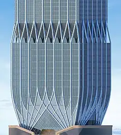 175 Park Avenue was designed by Skidmore, Owings, & Merrill,[3] with WSP Global providing structural engineering services.[2] The lobby of the building tapers outwards from its footprint in order to increase its visual separation from the adjacent Grand Central Terminal, and is defined by a web of interlaced steel columns which fan from several points at ground level, limited by the presence of rail infrastructure below the site. These columns are clad in a painted metal finish and continue for the height of the building.[4] The tower is interspersed with outdoor terraces and culminates at a lattice crown, where the exterior columns again interlace echoing the design of the lobby facade. The inverted tapering of the building's base allows for an approximately 24,000 square foot elevated public terrace designed by James Corner Field Operations, wrapping around the building's base and accessible by stair and elevators from 42nd Street.[5]