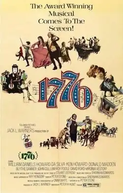 1776 is a 1972 American historical musical drama film directed by Peter H. Hunt and written by Peter Stone, based on his book for the 1969 Broadway musical of the same name, with music and lyrics by Sherman Edwards.[4] Set in Philadelphia in the summer of 1776, it is a fictionalized account of the events leading up to the signing of the Declaration of Independence. The film stars William Daniels, Howard da Silva, Donald Madden, John Cullum, Ken Howard and Blythe Danner.
