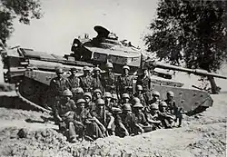 In 1942, the regiment was ordered to the Middle East to join the British Eighth Army. In the closing stages of the First Battle of El Alamein, the Poona Horse was the guard force for General Claude Auchinleck, the commander of the 8th Army at the tactical headquarters sited on the Ruweisat Ridge, the most prominent tactical feature of the Alamein position. This was the highlight of the Regiment's war for they were then ordered back to Iraq as part of the British Tenth Army.[10] In September 1944 the Regiment was sent to Cyprus on garrison duties and were still there in May 1945 when Germany surrendered.[10] The Regiment returned to India in October 1945 and were issued their first tanks, the Stuart MK IV.[10]