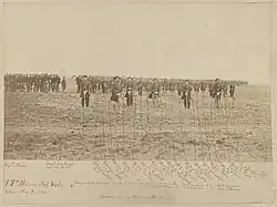 During the night, the men of the 17th heard the cries and moans of the wounded lying in the valley by the RF&P tracks between the two armies.[43] On Sunday, a truce went into effect to recover the wounded and bury the dead. On Sunday night, the Rebel skirmishers trying to find the U.S. Army's position were driven off before midnight, and through the night and early morning, the men of the regiment could hear the Confederates repairing and strengthening their lines.[44]