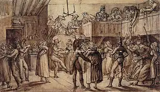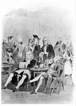 The bourgeois, or members of the middle class of Paris, financiers, merchants, shopkeepers, artisans, and those in the liberal professions (doctors, lawyers, accountants, teachers, government officials) were a growing social class. They were specifically defined by law as persons who had lived in the city at least a year in their own residence, and earned enough money to pay taxes. In 1780, there were an estimated 25,000 Paris households who fell into this category, about fourteen percent of the total.[21] Many of those in the upper middle class rose from modest social origins to amass very large fortunes. Many of the wealthiest bourgeois built their own palatial town houses in the Faubourg Saint-Germain, in the Montmartre quarter, the banking center of the city, or close to the Palais Royal. The upper middle class, once they had made their fortunes, frequently lived by buying the debts and collecting rentes from the nobility and the government, which during the 18th century were both always short of cash.[22] While the nobles tended to dress in rich and elaborate costumes and bright colors, the bourgeois wore rich fabrics but dark and sober colors. The bourgeois played a very active role in each neighborhood; they were the leaders of the religious confréries which organized charitable and religious activities for each profession, managed the finances of the parish churches, and ran the corporations which governed each profession in Paris.