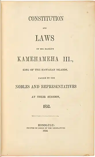 - ^ "Constitution of 1852 - Hawaii History - Short Stories". www.hawaiihistory.org. Retrieved 2018-10-31.