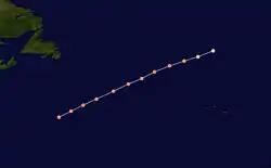 The sixth hurricane of the season was first observed as a tropical storm to the southeast of Bermuda on September 26.[10] Initially, the storm headed north-northwestward, before curving north-northeastward on September 27, while bypassing Bermuda. Later that day, the storm strengthened into a hurricane.[2] The brig Samuel and Edward encountered the hurricane on September 2, reporting winds of 80 mph (130 km/h); this was the maximum sustained wind speed associated with the storm. Thereafter, the storm executed a cyclonic loop, which lasted until September 30.[11][2] It curved northeastward on October 1 and was last noted at 0600 UTC, while located about 590 miles (950 km) northeast of Bermuda.[2]