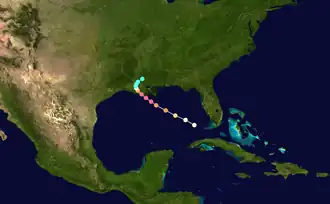 The cyclone was first detected in the eastern Gulf of Mexico 125 miles (201 km) west-northwest of Key West, Florida, on August 8, 1856. Because it was already a hurricane when it was first observed, it probably had developed further east than here. It advanced steadily northwest, strengthening to the equivalent of a Category 3 hurricane. The hurricane gradually slowed prior to landfall on August 10, and it attained its estimated peak intensity of 150 mph (240 km/h). It was a tropical cyclone of small diameter, and its maximum sustained winds may have reached Category 5 status, but were unrecorded. During the early evening of August 10 the northeastern edge of the eye crossed over Last Island (Official name: Isle Dernière) before making landfall a few hours later south of New Iberia, Louisiana. The cyclone is believed to have struck southern Louisiana at peak intensity with an approximate central pressure of 934 mbar (27.6 inHg).[2] A ship reported a peripheral pressure of 955 mbar (28.2 inHg),[3] so a lower pressure was based on the small size of the hurricane. It quickly weakened over land, and it diminished to a tropical storm on August 11. It dissipated over southwestern Mississippi on August 12 with fully tropical characteristics.[2]