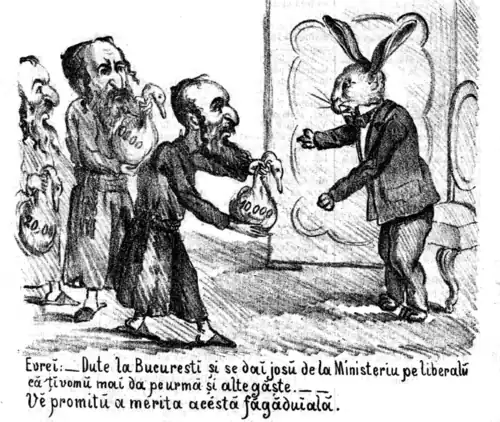 This change of attitudes alienated the Faction, and smaller riots erupted in Moldavia, this time specifically targeting both the Jews and Prime Minister Golescu.[81] On April 23, the latter resigned, officially for health reasons,[82] and was replaced by his brother, General Golescu, who took an even more moderate position on the "Jewish Question". Although faced with a motion of no confidence in Senate (where an alliance of Factionalists and "Whites" was formed), he and Brătianu were able to maintain their hold on power.[83] Their political survival was especially disappointing for a conservative hopeful, the Dolj deputy George Barbu Știrbei, who missed his opportunity to become prime minister, and left on self-imposed exile. Reportedly, his candidacy was rejected by Carol's father, the Prince Hohenzollern, who feared that Știrbei would use his status to usurp the Romanian throne.[84]