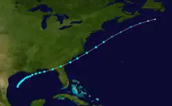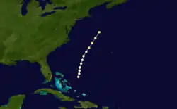 The first known tropical cyclone of the season was observed on September 3, about halfway between the Bahamas and Bermuda.[1] A nearby ship estimated winds of 80 mph (130 km), indicating the presence of the hurricane.[4] It moved northward initially, passing about 220 mi (350 km) west of Bermuda on September 4. Thereafter, the hurricane turned toward the northeast,[1] and the ship "John Richardson" encountered gale force winds on September 5, resulting in a wreck of its cargo.[2] On September 6, it was estimated to have reached peak winds of 105 mph (169 km/h), based on observations from the ship with the call sign "Greenock".[4] The hurricane lashed the ship with strong winds for 14 hours, killing the captain and one crewman. At the time, it was about 400 mi (640 km) southeast of Halifax, Nova Scotia.[2] Turning to the northeast, the hurricane passed south of Newfoundland before last being observed on September 7.[1]