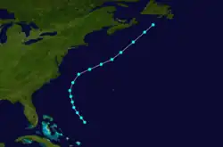 The bark Colchaqua encountered this storm nearly 900 mi (1,450 km) west of the Capo Verde Islands on August 29, recording sustained winds of 46 mph (74 km/h).[13] Moving towards the west-northwest, the storm steadily gained strength, and reached hurricane strength early on September 2. The storm peaked its peak intensity of September 6 with sustained winds of 90 mph (150 km/h) and a minimum atmospheric pressure of 980 mbar (29 inHg),[3] the former recorded by the ship Swallow and the latter by the ship State of Virginia.[13] Moving just to the west of Bermuda, the cyclone began to turn more northerly, and transitioned into an extratropical cyclone later on September 7. By the following day, the system made landfall in Newfoundland as an extratropical system.[3] On Bermuda, the hurricane generated huge swells and strong winds, causing sea spray that defoliated plants across the territory.[14]: 5 Approximately 1 in (25 mm) of rain fell in Halifax, Nova Scotia, during a 3.5 hour-period as a result of the storm.[11]: 37 The 2014 reanalysis study by Chenoweth concludes that this storm formed on September 2 and intensified more than HURDAT suggests, peaking as a strong Category 2 hurricane.[5]