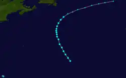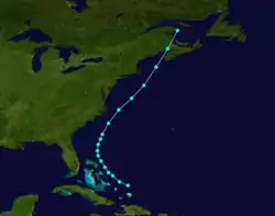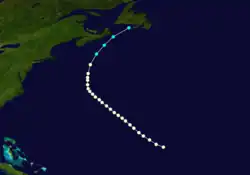 Although the steamer Antonio Lopez may have encountered this storm as early as September 11, a track could not be constructed as far back as that date because the location of the ship was not logged.[15] Instead, the Atlantic hurricane database (HURDAT) initiates the track as a Category 1 hurricane about 900 mi (1,450 km) northeast of the Lesser Antilles on September 16.[3] Reports from the ship Harley John and an unnamed vessel indicated the cyclone possessed sustained winds of 80 mph (130 km/h).[10][3] The hurricane moved generally northwestward for a few days until turning northward on September 20. Curving northeastward on the following day, the cyclone weakened to a tropical storm on September 22 before being last noted several hours later just offshore Newfoundland's Burin Peninsula.[3]