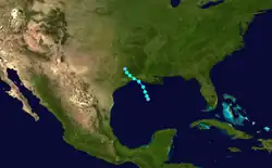 This storm, added to HURDAT in 2003, was first observed at Lake Charles, Louisiana, and Sabine Pass, Texas, on September 14.[4] A tropical depression, it quickly strengthened into a tropical storm while moving northwestward. At 05:00 UTC on September 15, the storm made landfall just east of the Louisiana–Texas state line with maximum sustained winds estimated at 60 mph (95 km/h). Early the next day, the cyclone weakened to a tropical depression and dissipated near Grapeland, Texas.[7] Chenoweth's reanalysis study proposed that this system formed over the Bay of Campeche on September 11 and made landfall slightly farther west, near Port Arthur, Texas, on September 15.[6] Port Eads, Louisiana, recorded winds of 70 mph (110 km/h) and a pressure of 995 mbar (29.38 inHg).[20] In Sabine Pass, Texas, the storm flooded streets with about 3 ft (0.91 m) of water, toppled fences, and damaged some homes, with one destroyed, injuring its occupant.[11]