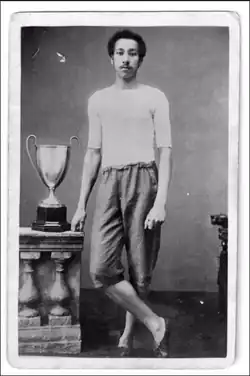 James Cowie (London AC) had won the 100 yards championship for the three previous years but wrote an open letter to Sporting Life to apologise to his many fans that he would be unable to defend his title this year due to an injury.[10] This left just two men in the first of three heats from which five men qualified for the final, to be run at three forty-five. Arthur Wharton, a student at Cleveland College in Darlington, caused a sensation by winning heat 3 in 10 seconds flat. The record at 100 yards had been in doubt for several years with many more or less dubious claims to have run ten seconds. Wharton was the first man to do it under championship conditions where there can be no doubt that all of the rules had been complied with, that the officials were fully competent and experienced men, that the time had been recorded on three accurate watches, and that neither the track nor the wind were offering any assistance.[9] In the final, forty-five minutes later, Wharton got away well and after covering 70 yards was two yards clear of the field. In the closing stages Charles Wood (Blackheath H.) narrowed the gap but Wharton reproduced his marvellous time and won by a clear yard.[3][5][12]