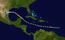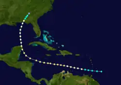 The bark Florence, stationed at Barbados on July 20, recorded squally weather and decreasing barometric pressures.[23] Consequently, the track for this system begins on that day about 150 mi (240 km) southeast of the island. Later on July 20, the cyclone entered the Caribbean after passing through Saint Vincent and the Grenadines. Intensifying into a hurricane early the next day, the storm reached Category 2 status on the modern-day Saffir–Simpson scale on July 22. After moving west-northwestward for its duration thus far, the hurricane turned northwestward over the northwestern Caribbean on July 25. The cyclone struck the northeastern Yucatán Peninsula later that day and curved northward. Weakening to a Category 1 hurricane over the Gulf of Mexico, the storm turned north-northeastward. Around 15:00 UTC on July 27, the hurricane made landfall near Fort Walton Beach, Florida, with winds of 85 mph (140 km/h), with an estimated barometric pressure of 978 mbar (28.9 inHg). The storm continued north-northeastward as a tropical storm, before dissipating late on July 28 near Atlanta, Georgia.[7] [23]