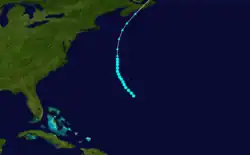 On August 14, HURDAT begins the track for this system just east of the Leeward Islands,[7] the same day that Saint Kitts reported squalls and falling barometric pressures.[5] Moving northwestward and then west-northwestward, the cyclone intensified into a hurricane by August 17. On the following day, the system passed within 40 mi (65 km) of the Abaco Islands, likely as a Category 2 hurricane. The hurricane then began curving northeastward on August 19 and intensified into a Category 3 hurricane. Sustained winds likely increased slightly to 120 mph (195 km/h) as the storm passed just offshore North Carolina on August 20,[7] based on the steamship City of San Antonio recording a barometric pressure of 967 mbar (28.6 inHg).[5][31] The hurricane continued out to sea and transitioned into an extratropical cyclone on August 22 about 250 mi (400 km) southeast of Cape Race, Newfoundland.[7]