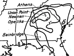 On Barbados, the storm caused several vessels to be wrecked or to be run aground. Although the hurricane passed far to the south of Cuba, it caused several vessels to sink at Batabanó and brought heavy rain and flooding to the islands interior.[24] In Florida, rainfall reached 8 in (200 mm) at Cedar Key.[25] Strong winds downed hundreds of trees and destroyed a college building, a mill, and several small homes in DeFuniak Springs. Damage in the town was estimated at $5,000. In Caryville, the storm partially destroyed a mill and demolished a church. Additionally, Holmes and Walton counties reported heavy agricultural damage.[26] Heavy rains fell in some other areas of the Southeastern United States, including a peak total of 16.5 in (420 mm) of precipitation at Union Point, Georgia.[27] According to The Atlanta Constitution, the Chattahoochee River overflowed its banks from Columbus, Georgia, to Apalachicola, Florida, submerging an average of 5 mi (8.0 km) of land along the waterway.[10] Consequently, extensive losses to cotton crops occurred, especially in Georgia and Alabama,[28] with agricultural damage alone estimated at $1.5 million.[10] One person drowned due to flooding in Georgia.[11]