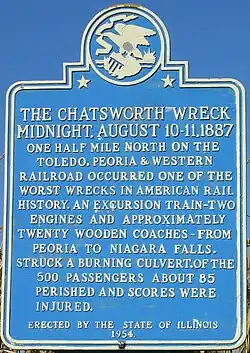 The Great Chatsworth train wreck was a major rail accident that occurred late on the night of August 10, 1887, 3 miles (5 km) east of Chatsworth, Illinois, in the United States. A Toledo, Peoria and Western Railroad (TP&W) train bound for Niagara Falls crossed over a trestle, weakened earlier in the day by a fire, causing it to collapse. In 2007, staff of the McLean County Museum of History wrote that "the Chatsworth Train Wreck probably ranks as the second- or third-deadliest U.S rail accident in the 19th century."[2]