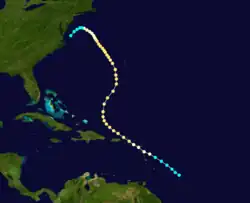 As meteorologist Ivan Ray Tannehill in 1938 documented this storm as far back as September 29,[7]: 37 the official Atlantic hurricane database initiates the track on that date about 425 mi (685 km) northeast of Paramaribo, Suriname. Moving northeastward, the storm struck Dominica late on October 1 with winds estimated at 50 mph (85 km/h). The storm passed through the British Virgin Islands on the following day. After re-emerging into the Atlantic, the system curved north-northwestward on October 3 and then northeastward on October 4. As the cyclone neared Bermuda on October 5, it nearly became a hurricane, peaking with winds of 70 mph (110 km/h). On October 6, the storm was last noted approximately 270 mi (435 km) southeast of Sable Island, Nova Scotia.[6]