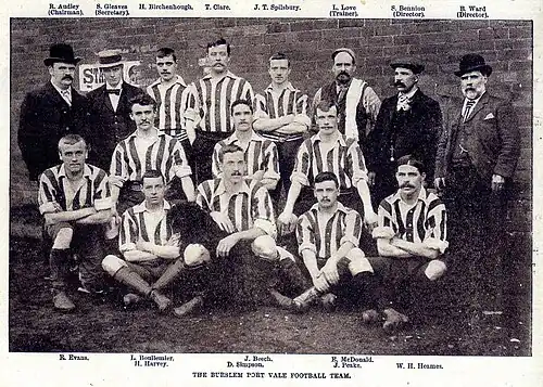 Their FA Cup win over First Division champions Sheffield United in 1897–98 won Vale the respect (and votes) they needed to win re-election to the Football League for 1898–99.[1][2] To ensure a competitive campaign they signed striker Howard Harvey from Aston Villa for £50 to bolster what remained a semi-professional squad with all the players maintaining jobs outside of football.[1] Winning their opening six league games, Vale conceded just one goal as they built a four-point lead at the top of the table. The 2–0 win over Grimsby Town on 1 October was attended by 6,000 spectators at the Athletic Ground to raise £117 in receipts. However, right-back Tommy Clare broke his leg in the Grimsby game, and the team's form never recovered without the former England international's guidance on the pitch. A top-of-the-table clash with Newton Heath at Bank Street ended in a 2–1 defeat as the home side scored the winning goal with three minutes left to play.[1]