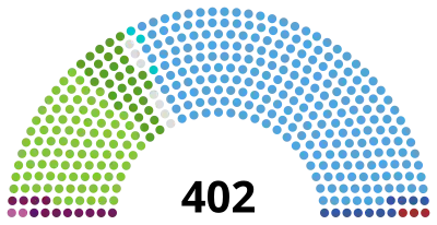 The Congress of Deputies was entitled to one member per each 50,000 inhabitants, distributed among the provinces of Spain.[18] 91 seats were distributed among 26 multi-member constituencies and elected using a partial block voting system: in constituencies electing eight seats or more, electors could vote for no more than three candidates less than the number of seats to be allocated; in those with more than four seats and up to eight, for no more than two less; and in those with more than one seat and up to four, for no more than one less.[19] The remaining seats—310 for the 1899 election—were allocated to single-member districts and elected using plurality voting.[20] Additionally, literary universities, economic societies of Friends of the Country and officially organized chambers of commerce, industry and agriculture were entitled to one seat per each 5,000 registered voters that they comprised, which resulted in one additional special district.[21]