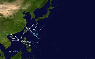 On October 18, a short-lived tropical cyclone existed east of the Ryukyu Islands. It was moving northeastward and was last noted on the next day.[21] A tropical storm was first observed on October 21 and moved westward through the Philippines over the succeeding days. It crossed the South China Sea and dissipated over east-central Vietnam on October 26.[22] Concurrently, a tropical cyclone was noted on October 24 northeast of the Philippines. It curved northwestward and later turned to the northeast, and was last noted on October 29 east of Okinawa.[23]