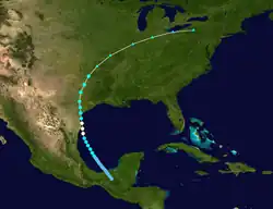 The second observed tropical cyclone of the season developed over Chiapas at 00:00 UTC on June 21. Initially a tropical depression, the system moved slowly northwestward and reached the Gulf of Mexico early the next day. Around 12:00 UTC on June 23, it strengthened into a tropical storm. While curving north-northwestward, the storm intensified into a hurricane at 00:00 UTC on June 26. Six hours later, the hurricane attained its maximum sustained wind speed of 80 mph (130 km/h). However, it then began to weaken falling to tropical storm status late on June 26. At 21:00 UTC that day, the storm made landfall near Corpus Christi, Texas, with winds of 70 mph (115 km/h). After moving inland, the system quickly weakened and became extratropical over Oklahoma by midday on June 28. The remnants moved rapidly northeastward before dissipating over Pennsylvania the next day.[3]