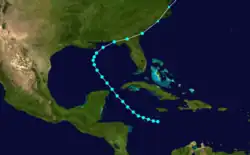 The first identified tropical storm of the season is listed in the Atlantic hurricane database as having formed on June 24, positioned in the western Caribbean;[1] the estimate for this location was based on ship reports, although the information was insufficient to guarantee an accurate position.[6] It initially meandered west-northwestward, though began to turn northwest during the latter half of following day. Late on June 26, it passed between the Yucatán Peninsula and Cuba, and subsequently entered the Gulf of Mexico shortly thereafter. The tropical storm continued to slowly intensify, and started to make sharp curve towards the northeast on June 28.[1]