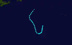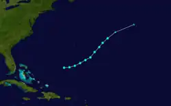The fourth tropical storm of the season was first detected by a ship on October 17 southwest of Bermuda;[10] in the HURDAT database, this date was considered to be the formation date, although the entire lifespan of the storm is unknown due to a lack of data on the system itself.[7] It initially moved east-northeastward, though later began to turn northeastward on October 18. The storm curved slightly towards the east-northeast on October 19, and became extratropical later that day before its dissipation on October 20. The storm maintained its peak winds of 50 mph (85 km/h) for most of its lifetime.[1]