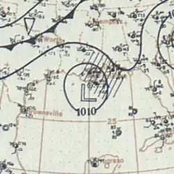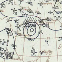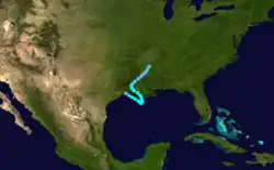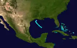 A ship first observed this tropical storm about 245 mi (395 km) north-northwest of Telchac Puerto, Yucatán, at 12:00 UTC on September 16.[1][5] The storm intensified gradually while moving northwestward, peaking with maximum sustained winds of 70 mph (115 km/h) at 00:00 UTC on September 18. However, the cyclone soon quickly weakened, falling to tropical depression intensity about 18 hours later. It then dissipated about 70 mi (115 km) south-southwest of the Texas–Louisiana state line.[1]