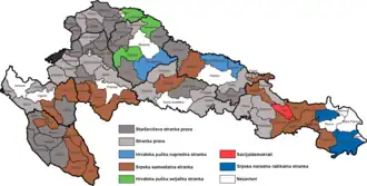 ![]() Results of the election in each of the electoral districts in 8 counties of the Kingdom of Croatia-Slavonia: the party with the plurality of votes in each district. Starčević's Party of Rights Party of Rights Serb Independent Party Croatian Peoples' Peasant Party Croatian People's Progressive Party Social-Democrats Serb People's Radical Party Independent | |||||||||||||||||||||||||