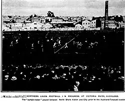 A further meeting was held at North Shore on the Wednesday evening at the Council Chambers in Devonport with 40 in attendance, and a club was formed. It was noted that they had the playing numbers for two teams and they had "taken the pick of the amateur players of the district club". The club would be called North Shore Albions. On the Thursday night a preliminary meeting was held in the city with 20 players attending with the goal of forming a club that was either a city team or a combination of a city and Ponsonby team, while a Newton club was also aimed to be formed the following week as there was "considerable dissatisfaction among the members at the management of the Auckland Union".[4] It was decided to play a match on the Saturday between the North Shore team and the city team. The match was duly played between North Shore and City and resulted in a win to the former by 44 points to 22.[5]