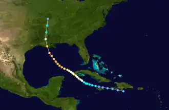 Map plotting the storm's track and intensity, according to the Saffir–Simpson scale