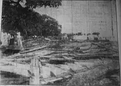 In New Orleans, the storm caused substantial damage, with many homes destroyed and ships wrecked.[17] Communication with the city was completely lost after most of the telegraph wires were downed. Around 3:00 pm on September 21, advisories from the New Orleans Weather Bureau ceased, leading to concerns over the state of the city. Prior to the communication loss, the Weather Bureau reported that waves along the Mississippi River banks were surpassing 3 ft (0.91 m) and water rise in New Orleans itself could reach unprecedented levels. Several lakes overflowed their banks as water from the Mississippi River back-flowed into them, flooding nearby lowlands.[18] The resulting floods, which inundated areas with upwards of 10 ft (3.0 m) of water,[3] were similar in scale to the flooding caused by Hurricane Katrina in 2005, nearly 100 years later. However, due to the lack of residential buildings in the area at the time, the flooding caused far less destruction than that of Katrina.[19] A report falsely claimed that the city's French Quarter was "swept away". A total of 306 coal barges sank off the coast of New Orleans and Lobdell (West Baton Rouge Parish), incurring over $1 million in losses.[17] Nearly every sugar cane plantation between New Orleans and Baton Rouge sustained damage, resulting in at least $1 million in losses.[20]