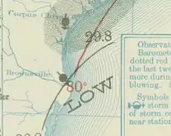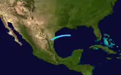 On August 26, a tropical depression formed in the central Gulf of Mexico.[4][5] It drifted westward for several days, and by August 30 it intensified into a tropical storm while turning more southwestward. The storm peaked in intensity as a weak tropical storm shortly thereafter.[5] On August 31 the storm moved inland near the mouth of the Rio Grande,[4] and weakened as it swept inland.[5] Advisories were issued for coastal areas before which strong winds and high tides affected the Texas coast. The cyclone inflicted some property damage in the Brownsville area.[4] Winds unroofed houses at Port Isabel and destroyed some Mexican huts. The storm also blew fishing craft aground. No initial reports of fatalities were received,[6] but two towns were left cut off from communication with Brownsville.[7]