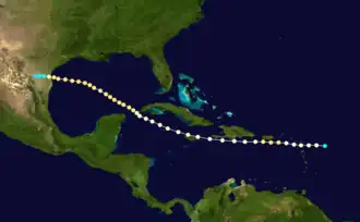 The modern Atlantic hurricane database documents the San Zacarías hurricane as developing east of the Leeward Islands by September 5, 1910, with estimated maximum sustained winds of 70 mph (110 km/h) accompanying the storm's first listed position at 06:00 UTC.[b] The storm intensified into a hurricane the same day and passed over the Leeward Islands, moving near Antigua in the afternoon before moving into the Caribbean Sea.[6][7]: 23 The hurricane passed south of St. Croix on September 6 with estimated sustained winds of 100 mph (155 km/h), equivalent to a Category 2 hurricane on the modern Saffir–Simpson scale.[6][7]: 23 Despite the hurricane intensity, the United States Weather Bureau was only aware of "unsettled" weather over the eastern Caribbean on the morning of September 6,[8]: 1456 and no warnings were in effect for Puerto Rico when the hurricane tracked south of the U.S. territory on the night of September 6–7.[7]: 24 At 23:00 UTC on September 6, the Weather Bureau indicated for the first time that a tropical cyclone was nearby.[9] The center of the hurricane passed 20 mi (32 km) south of Ponce, Puerto Rico, and the barometric pressure at San Juan bottomed out at 1008 mbar (hPa; 29.76 inHg).[7]: 24 [8]: 1456 Tracking west-northwest,[8]: 1456 the hurricane moved along the southern coast of Hispaniola between September 7–8.[7]: 23 It then passed just north of Jamaica on September 9 and continued south of Cuba between September 9–10.[7]: 23 The hurricane moved into the Yucatan Channel on September 10.[10]: 6 Although the hurricane database lists the storm as remaining a hurricane throughout its trek through the central and western Caribbean,[6] weather researchers Henry F. Diaz and José Fernandez Partagás assessed the tropical cyclone as weakening to tropical storm intensity between September 9–12 before restrengthening based on nearby weather observations and contemporaneous analyses by the Cuban National Observatory.[10]: 7