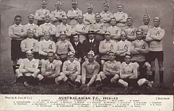 The 1911–12 Kangaroo tour of Great Britain was the second ever Kangaroo tour and was actually a tour by an "Australasian" squad that included four New Zealand players in addition to 24 Australian representatives.[1] It took place over the British winter of 1911–12 and this time, to help promote the game of Rugby league in New Zealand, the Northern Rugby Football Union invited a combined Australian and New Zealand team. They became the first tourists to win the Ashes.[2] and the last to do so on British soil for over half a century.[3] The tour was a success in performance and organisation. Matches were well attended, the squad's touring payments were maintained throughout and the players all shared in a bonus at the tour's end.