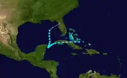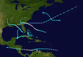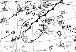 The final storm was first observed as a disturbance near Puerto Rico in the Caribbean Sea in late October.[17] The disturbance was the precursor to a tropical depression which developed over the southern Bahamas and headed west-southwestward across Cuba,[1] where, at Havana, winds blew from the southeast at 44 mph (71 km/h).[17] It became a tropical storm on October 27 and drifted southwestward. Near the eastern tip of the Yucatán Peninsula, the storm turned sharply northward.[1] An area of high pressure over the United States prevented the cyclone from turning eastward toward Florida, and it continued into the Gulf of Mexico. However, on October 31, the storm curved eastward and moved ashore over northern Florida. The storm decreased in intensity as it passed into the Atlantic.[17] The storm's circulation center remained poorly defined throughout its course. It was long believed to have developed south of Cuba, although a reevaluation of ship data indicated the depression had actually formed east of the island.[2] On October 26, the Weather Bureau hoisted hurricane warnings along the east coast of Florida from Key West to West Palm Beach, and on the west coast up to Tampa.[18]