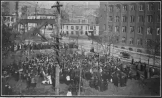 Soon after the strike began, organized labor advocates and socialists from the surrounding area began to come to Little Falls to help the strikers.[40] In Schenectady, located about 55 miles (89 km) down the Mohawk River from Little Falls, Mayor George R. Lunn, a member of the Socialist Party of America, recruited many to come with him to Little Falls to help organize the strikers and recruit more textile workers to join in picketing.[40] While Mayor Lunn wished to hold a rally at Clinton Park (an area located directly across the street from the Phoenix Mill),[33] city authorities took advantage of local ordinances to bar the socialists from holding the meeting, with one ordinance requiring permits from city officials to hold a rally and another forbidding gatherings of over 20 people in public.[41] These ordinances were often enforced inconsistently, as previous political rallies by Democratic politicians William Sulzer and Martin H. Glynn had been allowed, but were invoked to prevent socialists who attempted to speak at the park.[42] Local law enforcement officials were highly sympathetic to the mill owners,[34][19] and both Herkimer County Sheriff James W. Moon and Little Falls Police Chief James "Dusty" Long stated that speeches by the socialists could possibly provoke a riot and further civil unrest.[43] Many activists who attempted to speak in favor of the strike were arrested on charges of disturbing the peace or blocking traffic,[42] including Mayor Lunn himself on October 15.[44][35][15] Lunn refused to pay a $50 fine and was sentenced to a 50-day jail sentence.[45] Regarding the strike and involvement of the socialists, Police Chief Long stated, "We have a strike on our hands and a foreign element to deal with. We have in the past kept them in subjugation and we mean to continue to hold them where they belong".[34][19] In addition to law enforcement, local media institutions were also critical of the strike, with the Little Falls Journal and Courier expressing disapproval of the workers' decision to strike, saying, "The question of whether the wages paid were starvation or not, did not, and cannot enter into the merits of the case. The employer fixed the wages that he was willing to pay, and the men were at liberty to accept the employment or not. ... There were no extraordinary conditions, no disturbances, no suffering, no distress, so far as anyone here knew".[15]