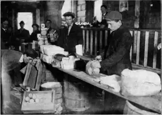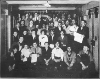 During this period of growth in Little Falls, business interests worked to prevent worker unionization, and in 1912, there were only 12 local unions in the city, representing only 6 percent of the population.[8] In the mills, only about 75 jack spinners were unionized,[note 1] constituting about a quarter of the entire union membership in the city.[8] These spinners, who worked 60 hours per week, made about $2.60 per day, which was higher than the daily pay for spinners in other nearby cities, but the majority of mill workers were not unionized and made substantially less.[14] In a study of the weekly pay of about 800 male workers, almost half made $9 or less, while less than a quarter made over $12.[15] Out of 900 female workers' weekly wages, about half made $7.50 or less, about a fifth made more than $10, and 30 percent made $6 or less.[15] Many workers complained of the low wages, saying that they were insufficient to provide for themselves and their family.[15] Nationwide, union membership remained relatively low, with only about 6 percent of the country's workforce in 1905 affiliated with the American Federation of Labor (AFL), a federation of labor unions that primarily focused on organizing skilled tradesmen into craft unions.[16] AFL leaders were relatively unconcerned with unionizing unskilled workers and viewed immigrant laborers, such as the workers at the mills in Little Falls, as a potential danger to the craft union movement.[17] Also in 1905, the Industrial Workers of the World (IWW, whose members are known as Wobblies), an anarcho-syndicalist union,[18] was established and began to organize unskilled workers in the country into industrial unions.[16] Unionization efforts by the IWW would eventually push the AFL to reconsider their approach to unskilled labor,[16] and the two organizations often engaged in competition to represent workers and lead labor strikes.[19] During the 1910s, the IWW attempted to organize many factories in New York,[2] and they were involved in several labor disputes in the state, such as the 1912 New York City waiters' strike in May of that year.[20] That same year, the union led a strike against the New York Mills Corporation of New York Mills, which involved many Polish immigrants.[21] In the United States during the early 1900s, many Polish workers were receptive to industrial unionism with the IWW and similar militant unions, such as the United Mine Workers of America.[22]