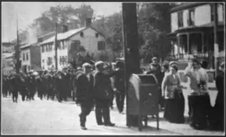 On October 9,[1][32] 80 workers at the Phoenix Knitting Mill performed a walkout due to the reduced pay they had received.[6][33] The walkout was a spontaneous action among the workers,[3] who were primarily immigrants such as Italians and Poles.[19][1] On October 18,[33] 76 workers at the Gilbert Knitting Mill also performed a walkout to protest their reduced wages.[6] Over the next several days, more workers began to honor the picket line, until the number of workers on strike was roughly equal to the number of workers who remained working,[6] with about 664 workers involved in strike action and a further 659 workers indirectly affected by the strike.[1][note 2] Around two-thirds of the strikers were women.[37] However, throughout the strike, many skilled workers and native-born Americans resisted in joining.[38] This was partially due to the fact that, in the past, the mill owners had hired immigrant workers to act as strikebreakers during labor disputes, such as in one that had occurred just two years prior.[38] On October 17, Schloss, who had been involved in organized labor and socialist causes during her career prior to Little Falls while working as a nurse in New York City's Lower East Side, resigned from her position as nurse and became a fervent supporter of the strikers, helping to organize and lead many parades and rallies and opening a soup kitchen to feed the strikers.[39]