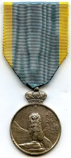 The medal was suspended by a ring through a suspension loop from a light blue 38mm wide silk moiré ribbon with 5mm wide yellow edge stripes.[1]
