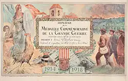 The 1914–1918 Commemorative war medal (French: "Médaille commémorative de la guerre 1914–1918") was awarded to soldiers and sailors for service in World War I. It was also awarded to civilians who met certain requirements. Created by Act of June 23, 1920, it was awarded to any military member for service between 2 August 1914 and November 11, 1918. It is also given to civilians who served in the same period in the army or the Interior.[1]