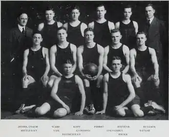 Under the direction of coach Ralph Jones, the 1917–18 season for the Illinois Fighting Illini men's basketball team, was unusual because World War I was happening in Europe. Co-captain George Halas, for example, left the team in January 1918 to help out with the war effort.[1] In only the second season of having 10 members, the Big Ten Conference continued their 12-game schedule of home and road competitions. The Illini finished their season with an overall record of 9 wins and 6 losses and a 6-win 6-loss conference mark. The starting lineup included co-captain Earl Anderson and B.E. Mittleman at the forward positions, J.S. Probst and P.C. Taylor at center, and co-captain George Halas and Burt Ingwersen as guards.[2] Anderson would be named a consensus All-American for the season.