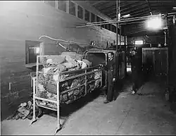 Men were separated from women and children into separate buildings, where they were stripped of all clothing and valuables. Most clothing and valuables were steamed. Other items which might be damaged by steam (like shoes, hats, or belts) were exposed to cyanogen gas. Attendants examined the nude people for lice.[11] The officers conducting the strip searches were rumored to have photographed the nude women and shared the photos to others at bars.[13] When lice were found on a man, the man's hair was clipped close to his head and the clippings were burned. For a woman, the hair was doused in a mixture of vinegar and kerosene, wrapped in a towel, and left on the hair for at least 30 minutes. If lice were found on re-inspection, the process was repeated. Once attendants declared the lice test had been "passed", the naked people were gathered in a bathing area and sprayed with a liquid soap made of soap chips and kerosene oil.[11] After collecting their sanitized clothing and dressing, migrants were evaluated by a foreman, vaccinated and given a certificate that they had completed the procedure. From the disinfecting area, migrants then entered the Immigration and Naturalization Service building for processing.[14]
