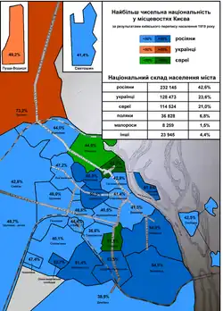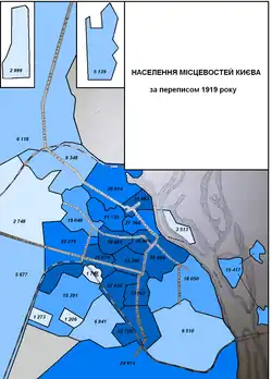 The most numerous ethnic groups in the city were found to be Russians, Ukrainians, and Jews.[1] The percentage of those identifying as Ukrainians within Kiev in 1919 increased from 12% to 24% when compared to the results of the 1917 census, while the percentage identifying as Russians fell from 50% to 42%.[3][4]
